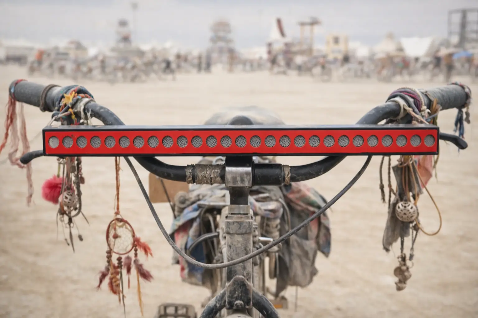 The bike-mounted HellaRAD is forty-seven inches wide, an inch and a half tall, eleven inches deep, and just over five pounds. At 50 feet the 2–6kHz audio beam is 4–6 feet wide, meaning it can be used to play higher-frequency sounds — baby laughter, bells, flowing water, birdsong — directly at one person, maybe two if they’re standing close and deserve it equally. Anyone outside that 4–6 foot wide zone won’t hear a thing. On a city street it cuts clearly over ambient noise at 50 feet. Across a park, it reaches out to 150 feet with authority. Fifty surplus cellphone speakers, a block of foam, a tiny 50W amp and a drone battery.