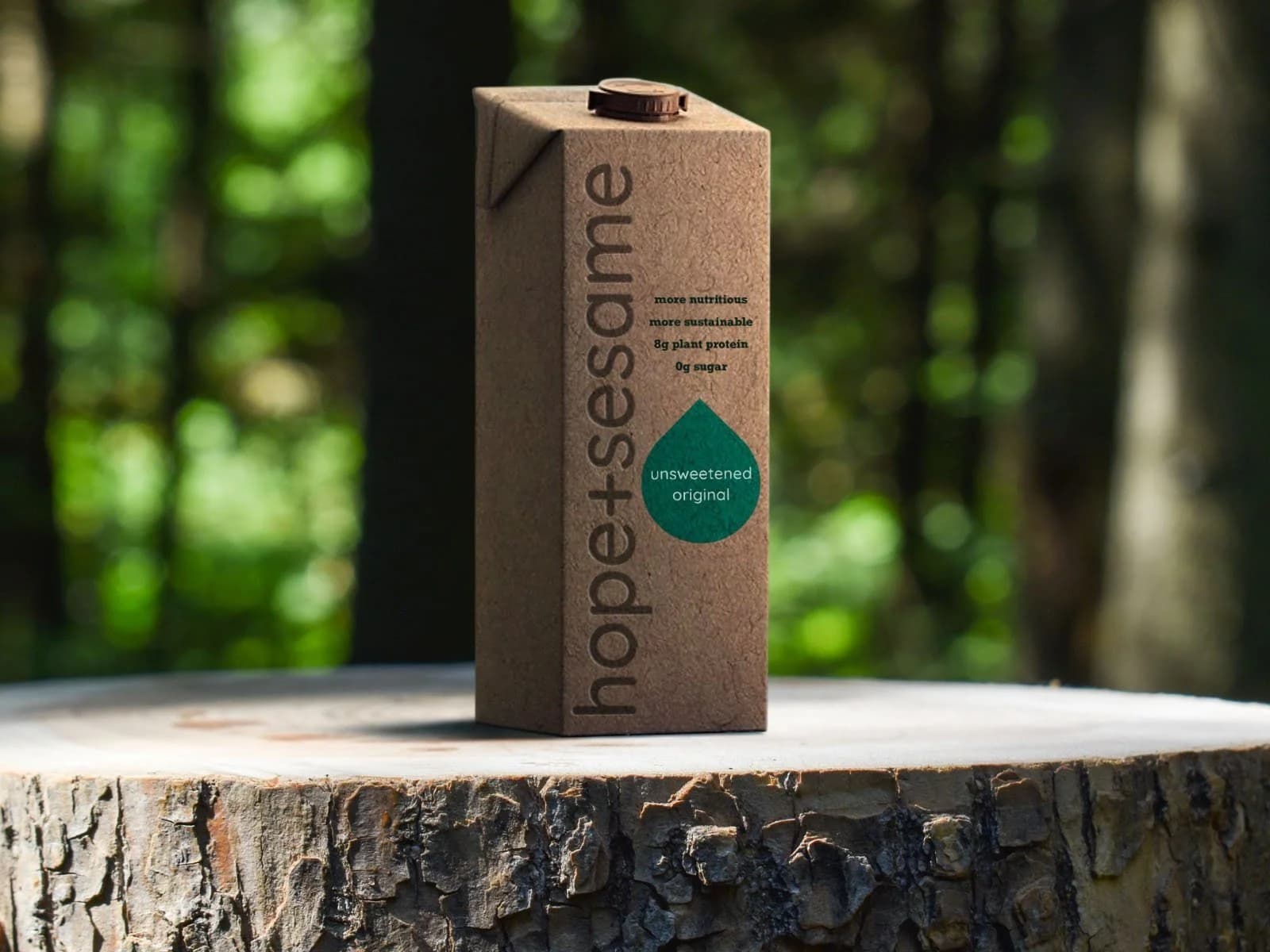 The concept below is for plant-based sesamemilk using Tetra Brik Aseptic 1000 Edge and plant-based LightCap 30 with Tetra Pak Craft. Over 80% plant-based material, recyclable, with a bare-paperboard look that communicates before you read a word of copy.