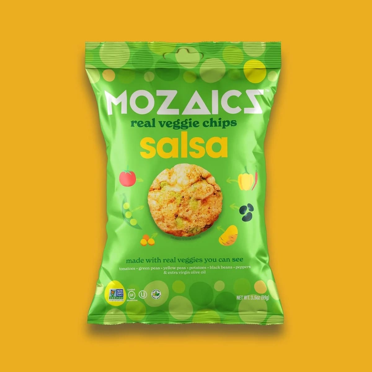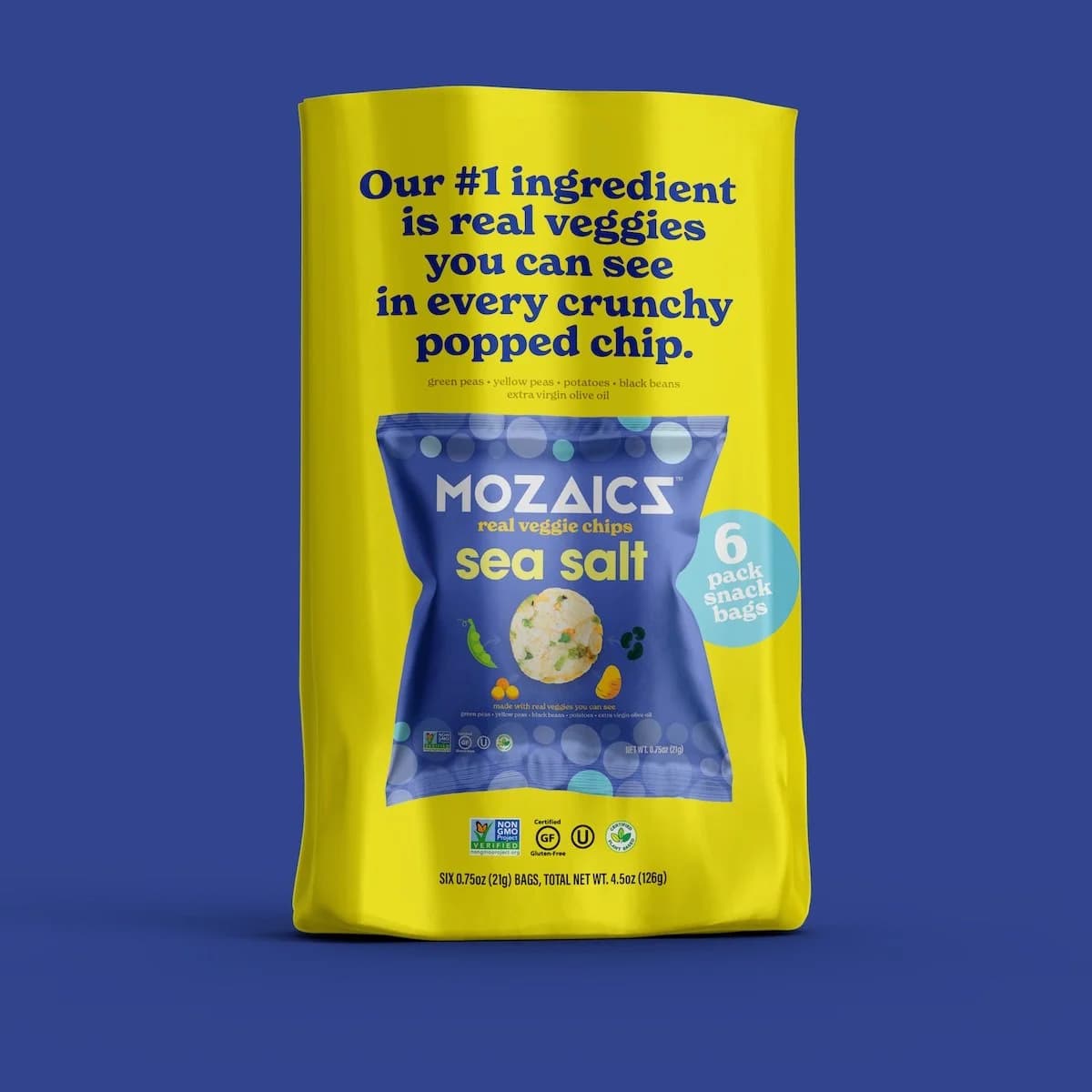 The Mozaics line in the header uses bold typography and color blocking to make an immediate visual statement on-shelf while keeping the product positioning clear.