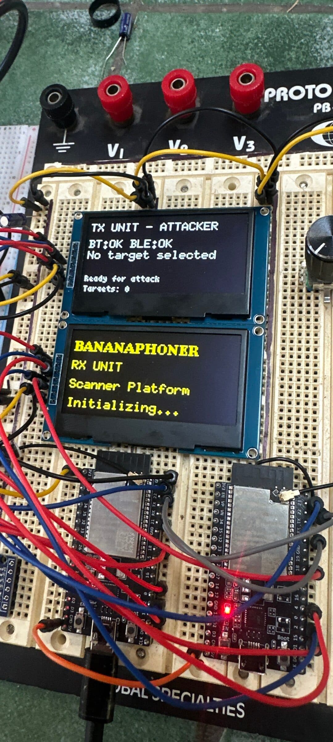 Inside: two ESP32 modules. One scans for Bluetooth traffic and identifies speakers. The other handles interaction. The main board hears everything equally; the external paddle antenna has more reach and a slight directional bias. That mismatch turns into a horizontal meter on the screen drifting left or right toward the signal. Closer to a metal detector than a dashboard.