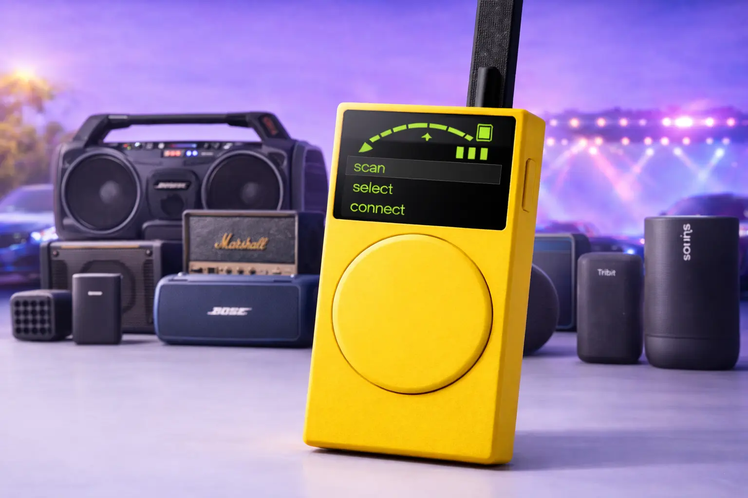 FCC Part 15 compliant. Tight power budget. Range in the tens of meters. The device cycles through standard connection patterns until a path opens, routes the audio, and plays back whatever file is on the device. The speaker treats it like any other source.